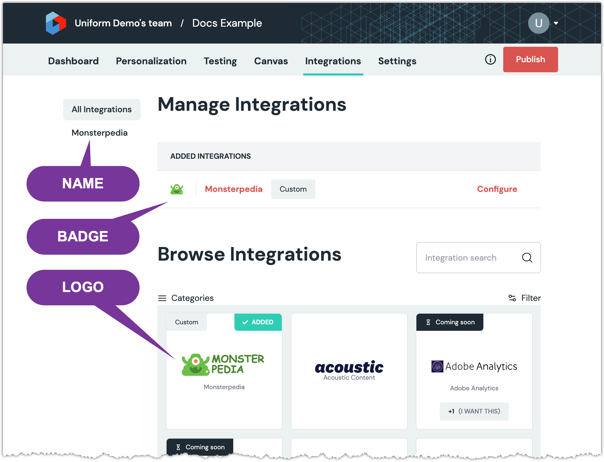 The values you enter in the fields for Name, Badge Icon Url and Logo Icon Url determine how your custom integration is displayed in the Uniform dashboard. The value you enter in Location Configuration is used to control other aspects of the user interface.