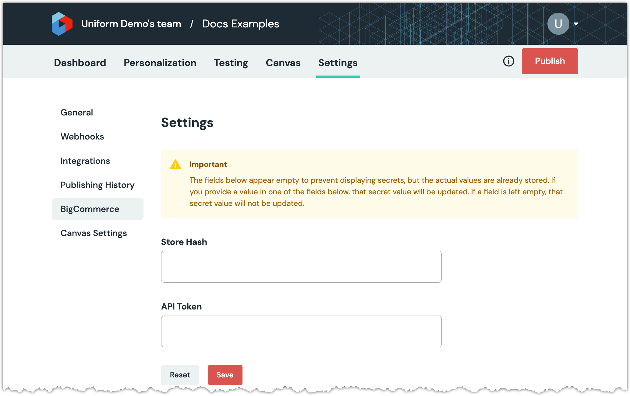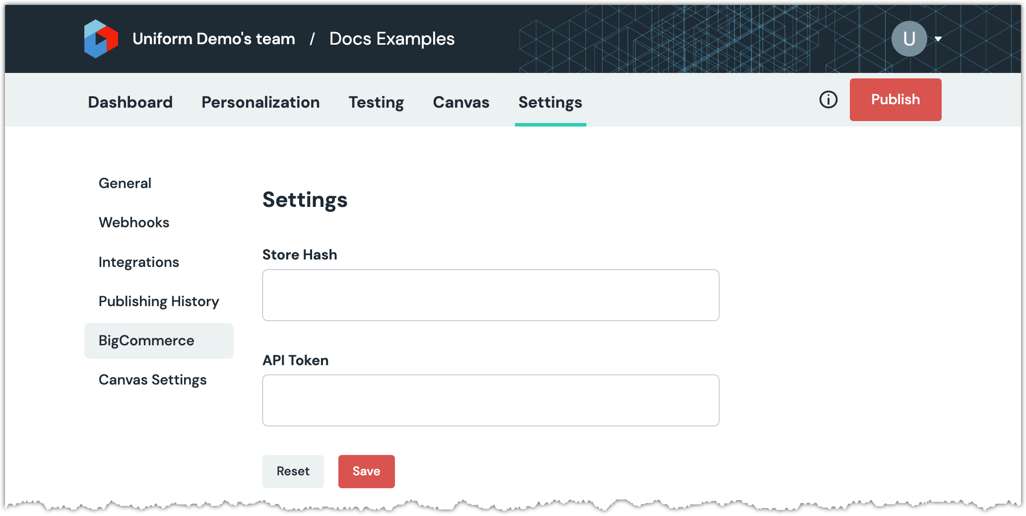 Uniform setting Value from text file Store Hash The value between stores/ and v3 in API PATH. For example, if the API PATH value is https://api.bigcommerce.com/stores/1a2b3cdefg/v3/, the store hash is1a2b3cdefg.API Token ACCESS TOKEN Click Save.