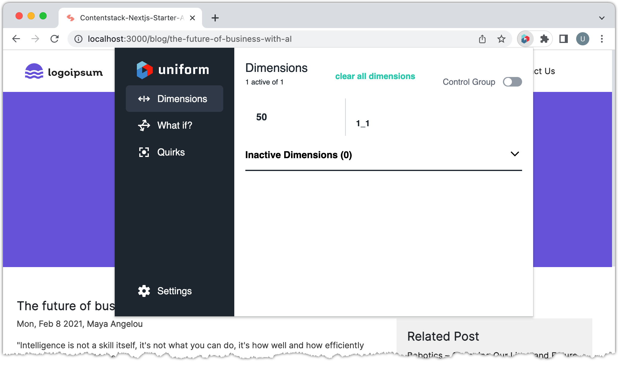 Now that you have a fully functional Next.js application powered with content from Contentstack and personalized using Uniform Context, you can use this as a starting point for exploring everything Uniform has to offer, including: