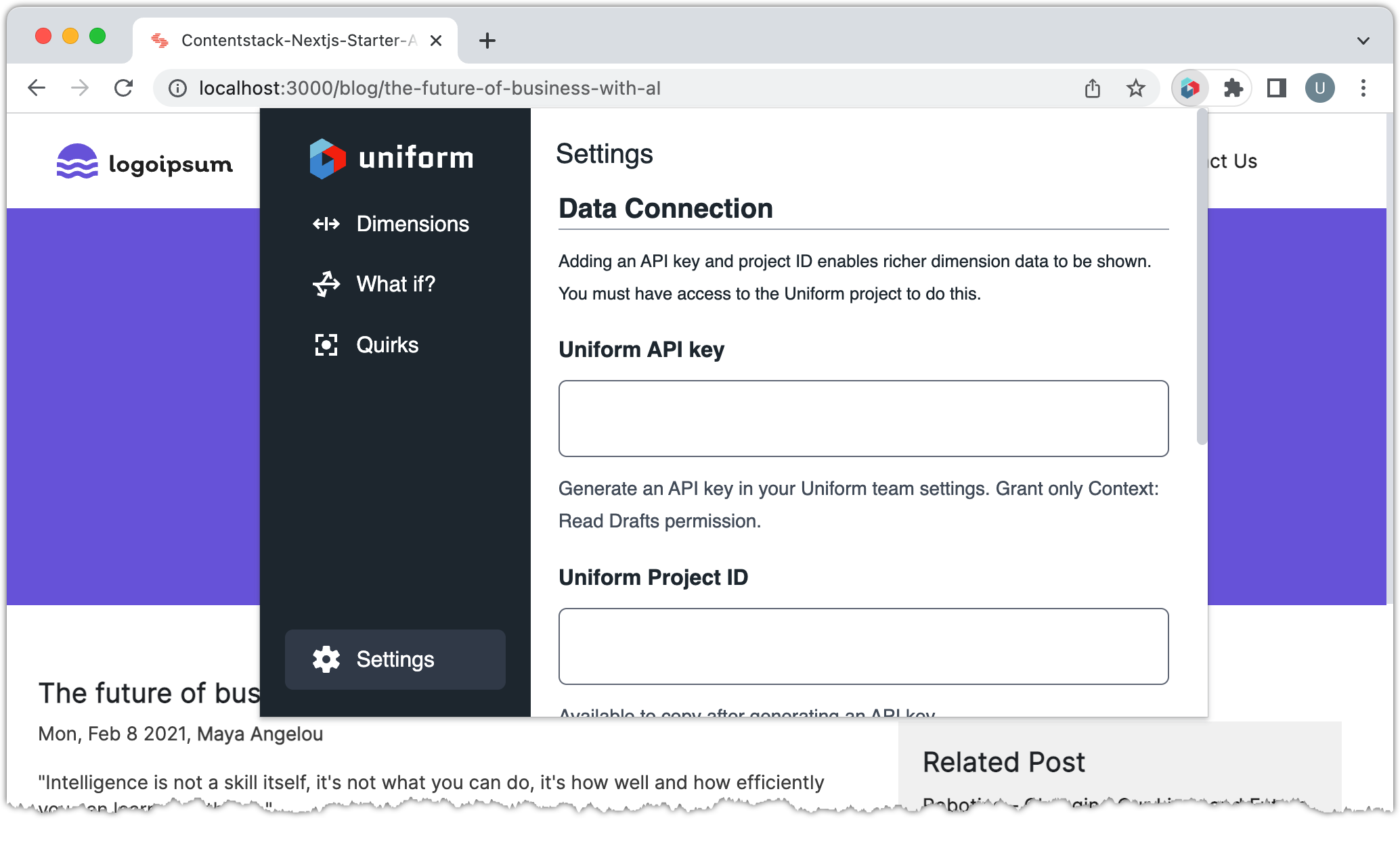 - Administrator access to Uniform - to configure the personalization settings that are available in Contentstack. If you do not already have a Uniform account, you can get a free one at https://uniform.app.