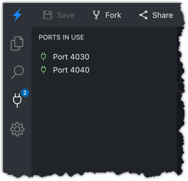 npm run canvas:basic:pushIn the activity bar the plug icon indicates that 2 ports are in use. Click this icon.